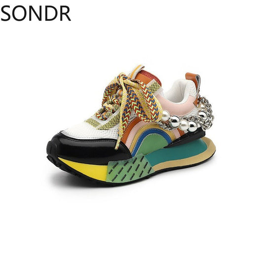 Womens Genuine Leather Sneakers Lace Up Rainbow Colors Platform Pearls Chain Decor Girls Shoes Korean Styles New