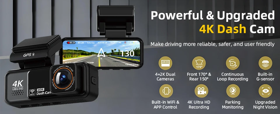 4K Dash Cam Built-in WiFi GPS HD Night Vision Driving Recorder Loop Recording Support APP Control 24H Parking Monitoring