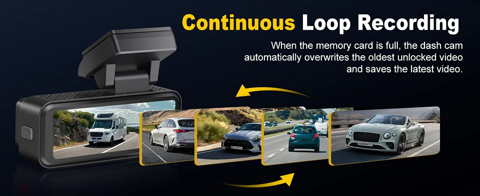 The dash cam continuously records while intelligently overwriting old footage (unless locked), ensuring you always have the latest videos without manual cleanup.