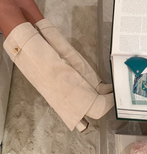 Boots with pointed toes large tube circumference straight tube metal buckle medium length tube thick heel women's boots