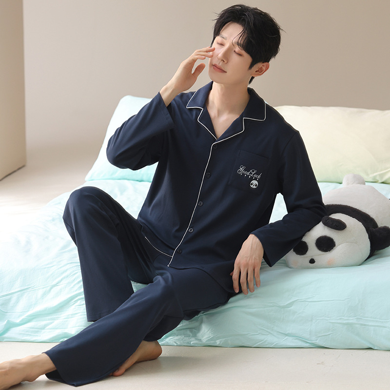 Paar-Pyjama-Set für Damen aus reiner Baumwolle, bestehend aus langärmeliger Hose, Reverskragen und Hausanzug.