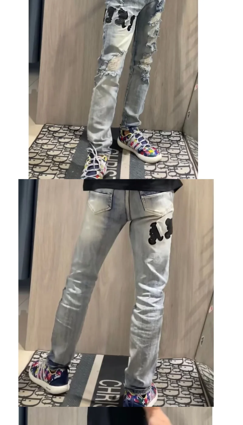Internet Celebrity Same Style Washed Distressed Ripped Jeans Embroidered Letters High Street Casual Versatile Slim Student Pants